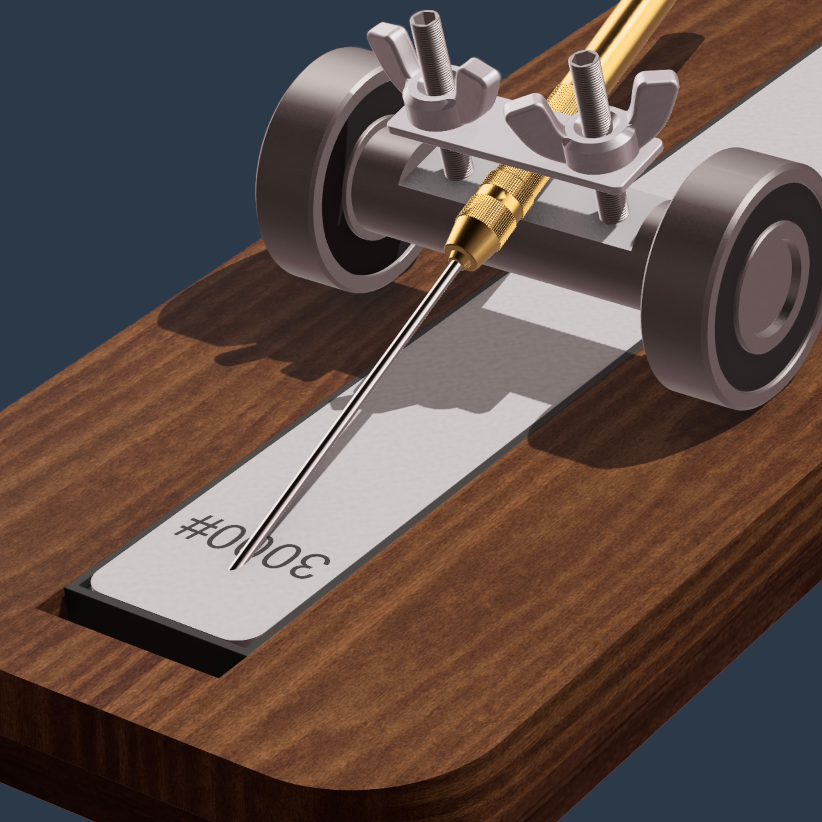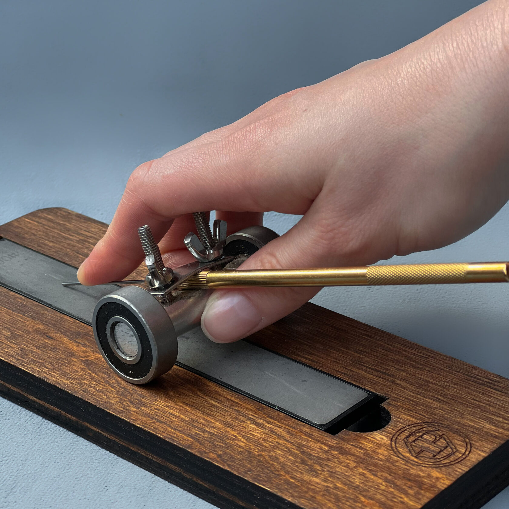 2) Каретка используется для позиционирования инструмента под определенным углом для заточки. Является необходимым приспособлением, без которого очень сложно корректно заточить инструмент. Подходит для заточки инструментов для расчистки (линза, скальпель, клин, пробник), восстановление торцов расточек, а также для плоских стамесок, резцов по дереву, штихелей, отверток шириной не более 15 мм
